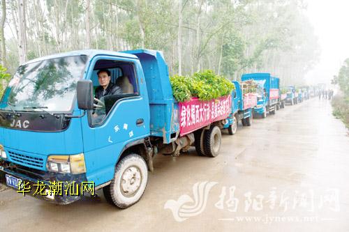 近日,揭西县启动新一轮绿化大行动,向17个乡镇示范村赠送36万株树苗,进一步推动乡村绿化,提升生态文明建设水平。图为该县组织车队送树苗下乡。特约记者 李维照 摄