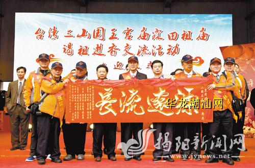 台湾谒祖进香团向揭西赠送了“源远流长”牌匾。欢迎仪式结束后,台湾三山国王500名信众举行了庄严肃穆的三山国王祭典仪式。“三山国王祭典”,是祭祀三山神的众多礼仪规制中,规格最高、规模最大、仪式最繁、时间最长的最高典礼。