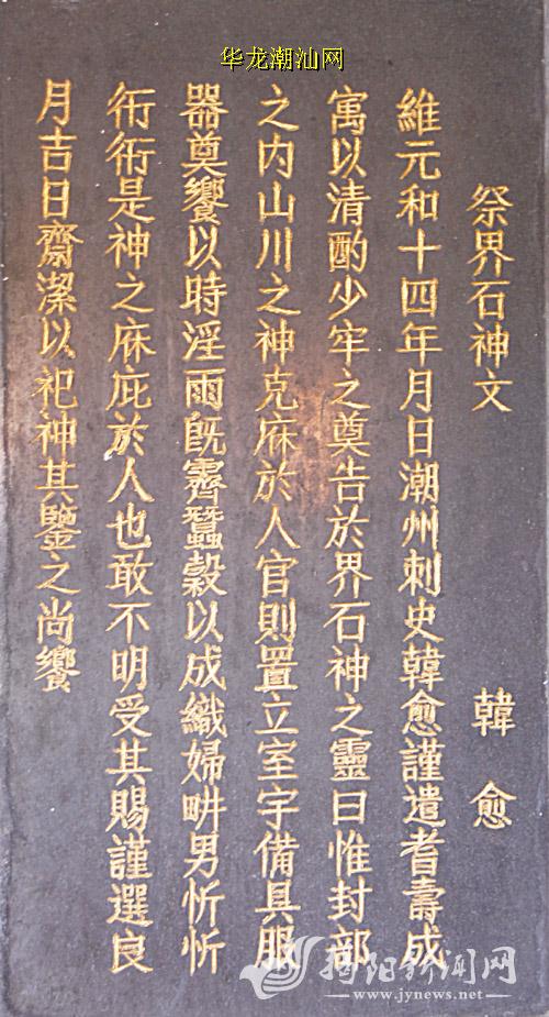 唐元和14年(公元819),韩愈因谏阻唐宪宗迎佛骨,触犯龙颜被贬任潮州刺史。韩愈上任之后,连月淫雨霏霏,农作物久浸受损,便求助于当时已神威显赫的“三山神”,果然不久雨停日出。韩愈遂择吉日良时,备下全猪全羊厚礼祭奠三山神;并写下《祭界石神文》。