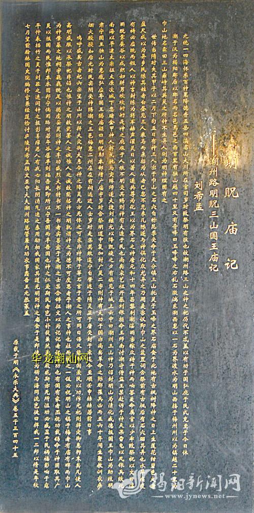 三山国王由宋朝皇帝确立其级别与地位之后,神威愈加显赫,庙宇愈加增广;据元《明贶庙记》记载:“潮之三邑,梅惠二州,在在有祠”(“三邑”指潮州府的潮阳、海阳、揭阳——作者注);由此可见三山国王祖庙早在700多年前的元代,就已经香火鼎盛非凡了。