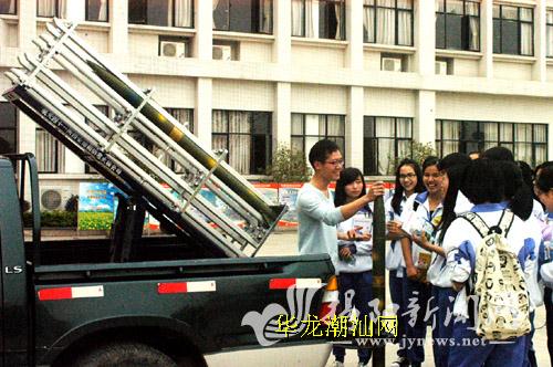 在活动现场,学生们观摩人工增雨作业装置。林生惠 摄