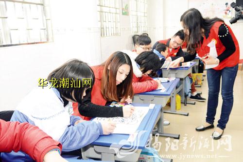 志愿者与市特殊教育学校的小朋友们共同在简笔画上绘画涂鸦。郑楚藩 摄