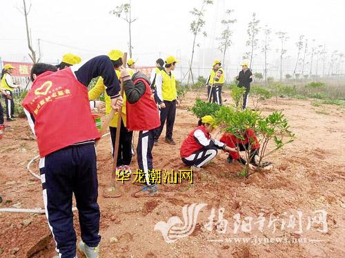 蓝城区大力实施“绿满蓝城。美丽家园”工程,加快在全区掀起新一轮植树造林高潮。 图为团蓝城区委组织志愿者到揭阳第三中学开展义务植树活动。 蔡熙德 摄