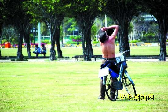 到了中午,日光出现,气温逐渐上升,20多度的“高温”让D城恍如夏天,街头上随即出现了不少“短袖党”。在时代广场,部分前来锻炼的市民抵挡不了炎热,甚至除去外衣,赤膊上阵。