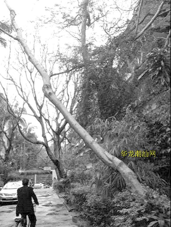 本报讯 (记者 黄泽春 摄影报道)“这里住宅楼旁一棵10米高的大树摇摇欲倒,由于整个树身出现严重倾斜,随时有可能砸向附近通道地面!”昨天下午,有热心市民向记者反映,这一险情便出现在市区金美街4栋附近,希望有关方面能够尽快予以处理,及时排除这个安全隐患。
