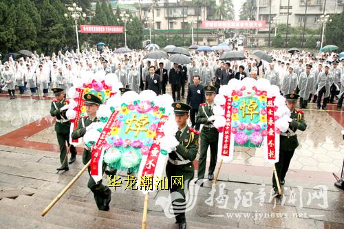 当天活动在绵绵细雨中举行。市委书记、市人大常委会主任陈绿平代表市四套班子成员,市委常委、榕城区委书记刘光明代表榕城区四套班子成员,市老游击战士联谊会会长代表市老游击战士联谊会分别向革命烈士敬献了花圈。全体参会人员向革命烈士三鞠躬,并绕行瞻仰烈士纪念碑,深切缅怀为民族复兴、国家富强和人民幸福而英勇牺牲的革命先烈,表达继承先烈遗志、践行群众路线、建设美好未来的坚定信念和坚强决心。