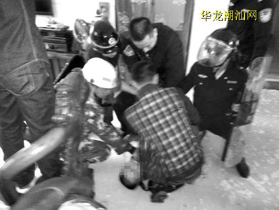 本报讯(记者 林子海 林鹏 通讯员 林炜龙 摄影报道) 前天中午12时许,潮阳区铜盂镇桶盘村乡政府附近一住户家中的男性精神病患者突然发病,挥舞菜刀叫喊要砍人并欲点燃煤气瓶。危急关头,潮阳消防官兵和辖区派出所紧急处警,一个小时后果断进屋制服该男子,成功化解了险情。