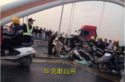 潮州金山大桥上发生一起致2人当场死亡、1人送医院抢救无效死亡的交通事故。 当天下午5时30分左右,市公安局110报警台接报:在金山大桥上发生一起大货车与小汽车碰撞交通事故,有人被困车中。接报后,交警市区大队民警迅速赶赴事故现场,并及时联系消防、医院派人到场,抢救受伤人员,疏导交通。 经初步调查,郭某磊(男,28岁,安徽亳州人)驾驶的重型半挂牵引车(车牌号:皖S2G215)拖挂挂车(车牌号:赣LF381)自东往西行驶至市区金山大桥中段,与楼某(男,28岁,广西柳州人)越线驾驶的小轿车(车牌号:桂BP0587)迎面相撞,造成楼某及其车上乘坐人员徐某强(男,26岁,广东梅州人)当场死亡,另一乘坐人员王某成(男,26岁,山东潍坊人)受伤送医院抢救无效死亡,小轿车严重损坏。 目前,重型半挂牵引车司机郭某磊已被警方控制,事故正进一步调查处理中。