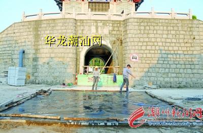 目前,我市旧城区修缮建设项目进展顺利。为确保交通、行人及施工安全,近日,施工单位对下水门及内侧防洪通道路段进行封闭施工。图为昨天下午,施工人员在为刚刚铺设的刻有双凤图案的青石板砖进行清洗。 陈宏文 龙兰 摄影报道