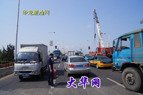 下午2点20分左右,参与交通救援的吊车和其它车辆赶到事故现场,开始起吊事故车辆和集装箱。为了让救援工作顺利开展,大桥在2点30分对汕头往潮阳方向进行封闭。此时,通往C石大桥的西提路一带也出现塞车,但交警人员及时到场疏导,大量过海车辆纷纷改道。
