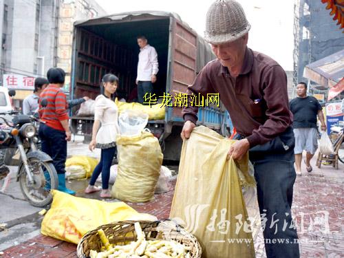 近段时间来,大洋苦笋适时上市,成为人们喜爱的时菜佳肴。图为经销商在揭西县五经富镇桥头市场收购大洋苦笋。杨继斌 摄