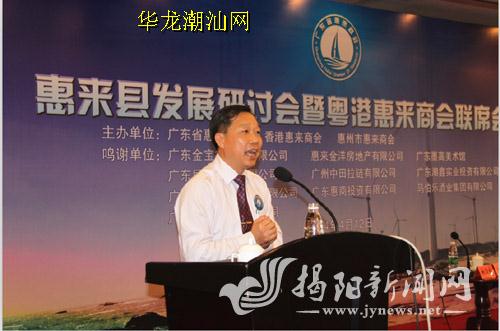 4月12日下午,惠来籍政界、科技文化界以及广东省惠来商会、香港惠来商会、惠州惠来商会的精英等约400人欢聚一堂,在广州珠岛宾馆联合举办"惠来县发展研讨会暨粤港惠来商会联席会议",共商惠来发展大计。