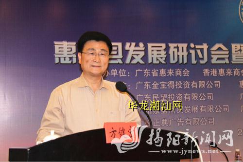 广东省文化厅党组书记、厅长方健宏在会上作了发言。他认为,惠来独特的区位、资源等优势以及改革发展热潮,为民营企业带来了无限商机。他希望,惠来在加快社会经济发展的同时,对文化建设要高看一眼,厚爱三分,全力促进惠来文化的快速健康发展。