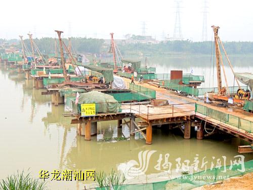 潮惠高速棉湖大桥全长1170.6米,共46跨。工程目前已完成全部桩基及部分墩柱,技术人员正抓紧灌注墩柱,争取在汛期前完成大桥下部构造,力争在2015年2月完成该桥的梁板架设。图为大桥施工场面。特约记者 李维照 摄