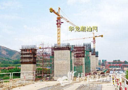 段计划于2015年通车,其中揭西县河婆街道横江河大桥段已完成总工程量近20%.图为施工场面。