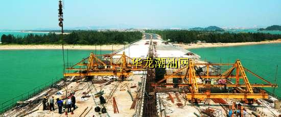 南山湾产业园南侧的疏港大道是连接汕头市产业转移工业园各片区的交通要道,是南山湾产业园项目的重要组成部分,分为东、西两段。濠江大桥是疏港大道的关键工程,桥梁全长约900米,桥面宽度32米,双向6车道设计,主桥采用变截面连续箱梁结构,主跨120米,最高净空13米以上。记者在现场看到,两个主跨桥墩上的桥面正不断向两边延伸,预计今年6月份即可合成。记者了解到,目前整个疏港大道路面清表清障基本拉通,疏港大道西段(安海路-达南路)已经建成通车;疏港大道东段(含濠江大桥)正在加快建设,疏港大道争取2014年全线通车。