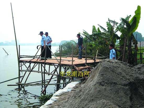 本报讯(记者 黄泽春 摄影报道) 近来,个别市民在梅溪河边的堤防上违章搭设建筑物,以作娱乐休闲之用。针对这一情况,龙湖区水务部门近日联合市水务局、水政监察支队和澄海区水务部门,一起在韩江下游的梅溪河等堤段开展联合巡查执法行动,及时查处了一批水事违法行为。