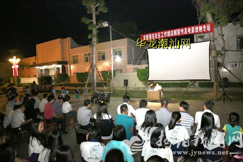 为推进党的群众路线教育实践活动开展,增强群众法律意识,丰富群众文化生活,发挥优秀电影的教育作用,4月28日晚,市驻侨东社区工作组在文化、司法部门的支持下,在大南山侨区区委区政府门前灯光球场开展法制宣传和优秀电影放映活动。