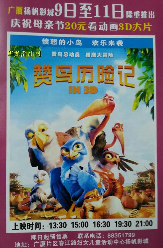 本网讯 广厦扬帆影城前阵子推出的“花20元看大片”活动得到了市民的热情捧场,观看《美国队长2》、《里约大冒险2》的观众十分踊跃。在母亲节来临之际,影院方满足观众的热切要求,特地在这周末继续举办“20元看大片”优惠活动:这次看的是《赞鸟历险记》, 5月9日-11日在黄金时段13:30、15:00、16:30、19:30、21:00 放映。