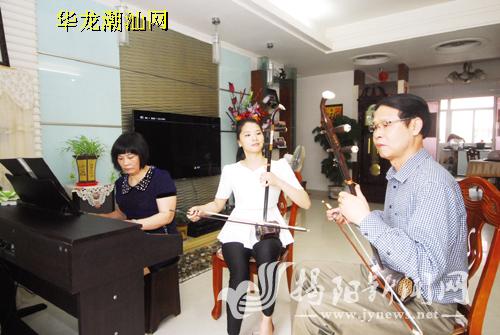 初夏午后,记者来到吴明文家采访,有缘一睹这个幸福家庭的风采。激情澎湃的二胡曲子《赛马》把记者吸引住了,原来这是吴明文和妻子陈琼凤、女儿吴斯梦一家人在“大合奏”,这是他们家每天的必修课。“人要把学习当做一生的工作来履行,打从斯梦刚上小学接触乐器开始,我们就养成每天一起学习不少于1小时的好习惯。”吴明文告诉记者。在父亲的二胡声中成长的吴斯梦今年4月以优异成绩考取广州大学表演系二胡专业硕士研究生。