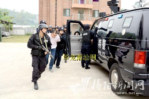 为积极应对严峻的反恐斗争形势,确保全市社会大局稳定,近期以来,我市公安等有关部门多次组织反恐演练。图为市公安局特警队员在演练中成功擒获“恐怖分子”。郑楚藩 摄