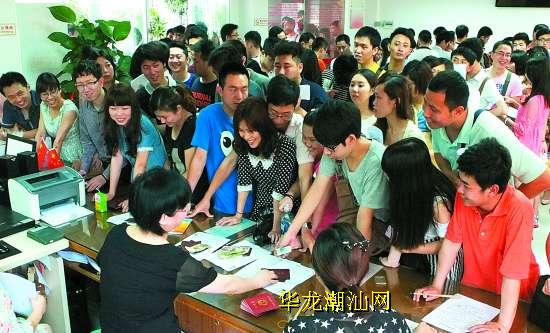 今天是“5·20我爱你”的好日子,一大早,金平区结婚登记处排起了百余米长龙,截至上午11时,已完成登记200多对,预计今天全部登记有400多对。一位正在排队的年轻人告诉记者,他在东莞工作,昨天专程赶回来登记结婚。 本报记者 张烈华 摄
