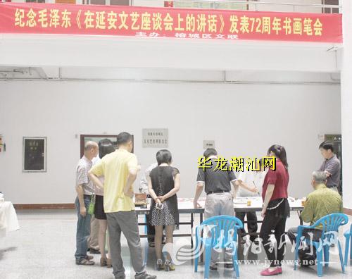 为纪念毛泽东《在延安文艺座谈会上的讲话》发表72周年,榕城区文联于23日上午举行书画笔会,特邀该区部分国画家进行笔会交流,探讨榕江国画艺术的传承和弘扬,并在活动现场挥毫泼墨,交流技艺。图为活动场面。张 瑜 少 畅 摄