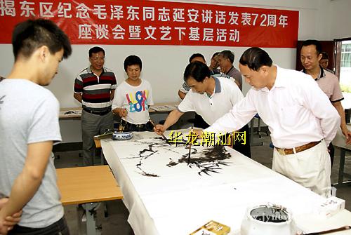 23日,揭东区文艺界人士40多人,欢聚揭东云路中学,纪念毛泽东同志在延安文艺座谈会上的讲话发表72周年。与会文艺界代表纷纷表示,要以重温延安讲话精神为契机,结合党的群众路线教育实践活动和揭东加快发展、科学发展、跨越发展的实际,创作出更多讴歌深化改革、讴歌中国梦的文艺精品。座谈会后还举行了文艺笔会。图为文艺家们现场创作作品。林建南 陈路文 摄