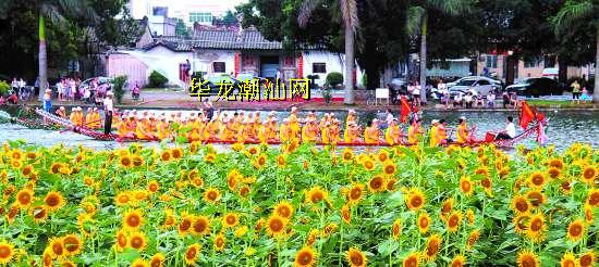 金平区沟南社区群众举行赛龙舟、吃龙舟饭等民俗活动,迎接端午节的到来。当地河岸栽种的大片向日葵正值花季,吸引了大批市民前往赏花观龙舟赛。