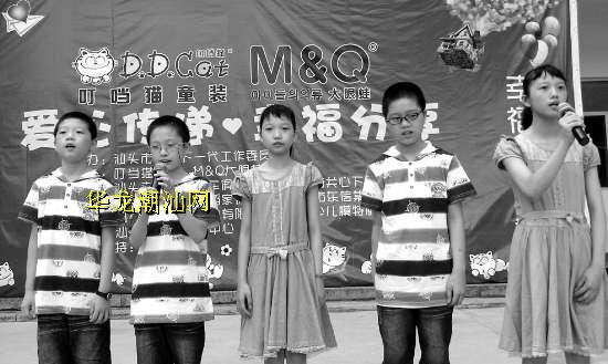 本报讯 (记者刘婉萍摄影报道)5月30日下午,潮阳区河溪镇中心小学里热闹非凡,由市关工委携手“叮当猫童装”等单位联合举办的“爱心传递 幸福分享”主题活动正在这里火热进行。活动中,最令人瞩目的是被誉为“奥运五福娃”的汕头“五胞胎”,他们也来到出生地河溪镇,和同龄小学生分享他们成长的幸福,将社会给他们的爱传递给更多的孩子。