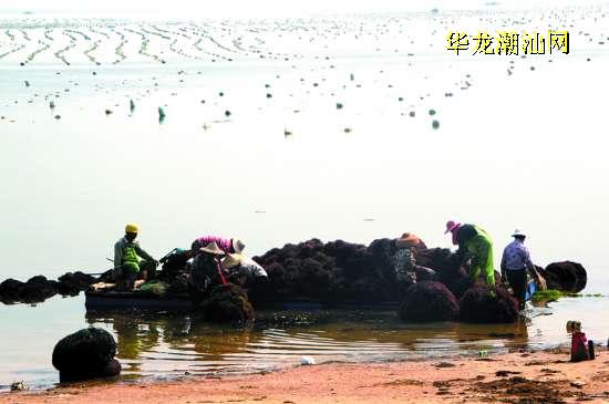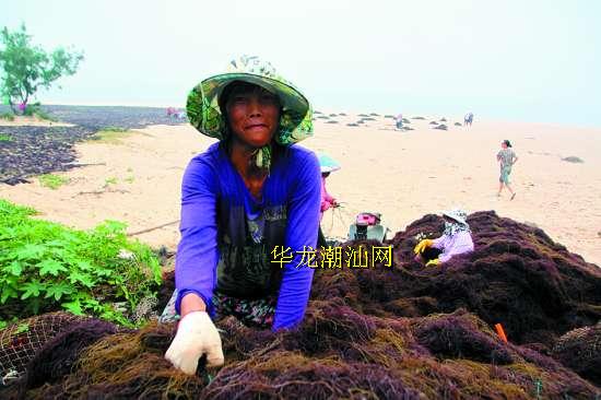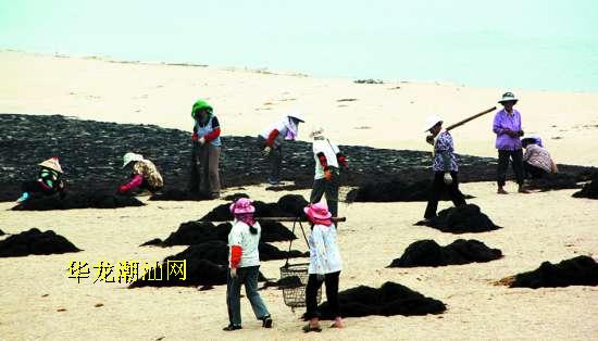 沙滩上,道路边,铺晒着的都是龙须菜。近期如果登上南澳岛时正赶上天晴,就会看到壮观的晒菜场景。目前正是龙须菜丰收的时节,但近一段时间来雨水多,晒菜的时机难能可贵,太阳一出来,养殖户们便集中赶着天晴铺晒龙须菜。阳光下,铺天盖地的龙须菜绵延不绝,形成了海岛独特的景象。