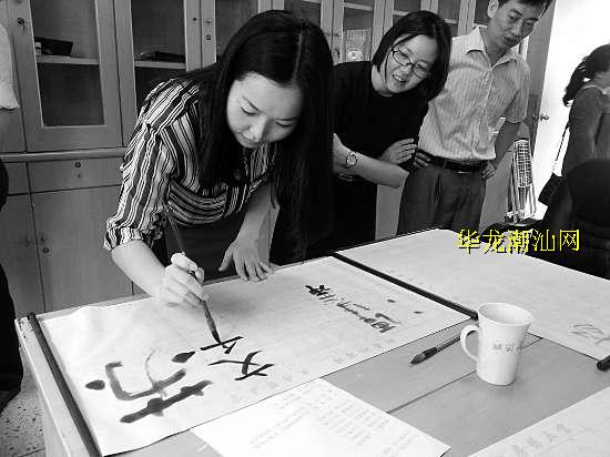 据承办方星潮留文化传播有限公司介绍。汕头华侨众多,潮人第三代第四代后裔大多不会讲汕头话,对家乡也比较陌生。举办这样的活动,就是想增进新生代潮人的家乡认同感。在汕期间,聚英中学这批学生中一部分人还前往南澳山顶小学进行公益助学活动,为海岛学生赠送书籍。(图为聚英中学的老师学习中国书法)