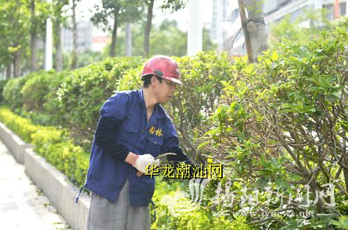 在全面推进新一轮绿化揭阳大行动中,我市园林部门进一步加强城市景观绿化工作,适时对园林植物科学管养。连日来,园林工人在市区多个路段,对绿化带树木进行修剪,使绿化带造型更加优美靓丽,有效提升城市品位,优化人居环境。图为园林工人在市区临江北路修剪绿化带树木。