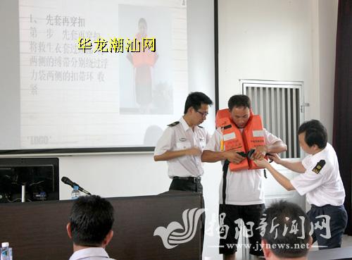 渡船交接仪式后,执法人员为村民们讲解如何正确使用救生设备。通讯员 摄