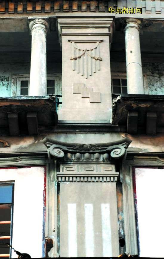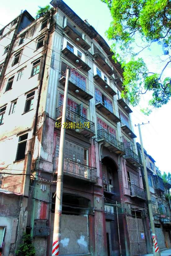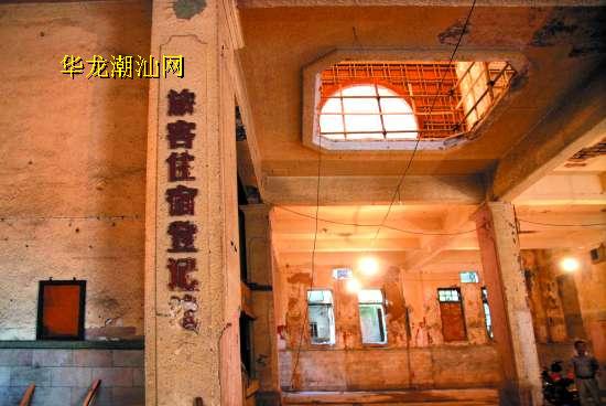 汕头大厦建于1933年,位于永平路11号,是一座中西合璧、三开间的八层钢筋水泥建筑,曾是汕头商埠最高的标志建筑,被业界誉为“粤东地区餐饮业的历史象征”。记者近日在施工现场看到,原本被水泥墙封掉的大厦如今“开放”了,门匾上的“汕头大厦”虽铅华褪尽,但四个字仍遒劲有力。大厦室内灯火通亮,数名施工人员正在各楼层忙活着。在楼下的大厅内,墙壁上体现特殊时代产物的“(团)结起来,争取更大胜利”的红色大字依然清晰可见,只是缺失了“团”字。在通往二楼的楼梯旁墙上,“旅客住宿登记”几个竖排字,印证了大厦当时“笑迎天下客商”的盛况。楼梯旁当年闻名的电梯现在已被拆除,只剩下一个电梯井的位置。当年经营冻汽水、冰棍雪糕的冷冻区现在也是空空如也,只剩下墙上的“冷冻品”三个字,供人回忆昔日夏季市民到大厦饮冰消暑一座难求的盛况。还有,楼上的圆形拱门、彩色玻璃窗、罗马柱等等,都让小时候曾在大厦游玩过的记者勾起了童年的斑驳记忆。这些尘封了多年、留下时代烙印的精细建筑格局再次确认了当年集餐饮、娱乐、酒店于一身的汕头大厦的“江湖霸主”地位。