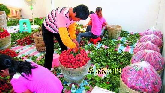 7月7日上午10时多,冒着骄阳酷暑,记者来到位于潮南区雷岭镇东新村双洋路旁的一个荔枝收购点。这是当地一个规模较大的收购点,去年共收购了近800吨荔枝销往外地。在一楼的加工场地,6名当地妇女正忙着挑拣刚从山上采摘而来的新鲜“桂味”荔枝,然后放进一个个竹筐并用薄膜包扎起来(见图),红果绿叶煞是好看。据收购点员工老张介绍,这些荔枝每袋重约25公斤,包装完毕后将用货车运往深圳销售,时间正好能赶上晚市。