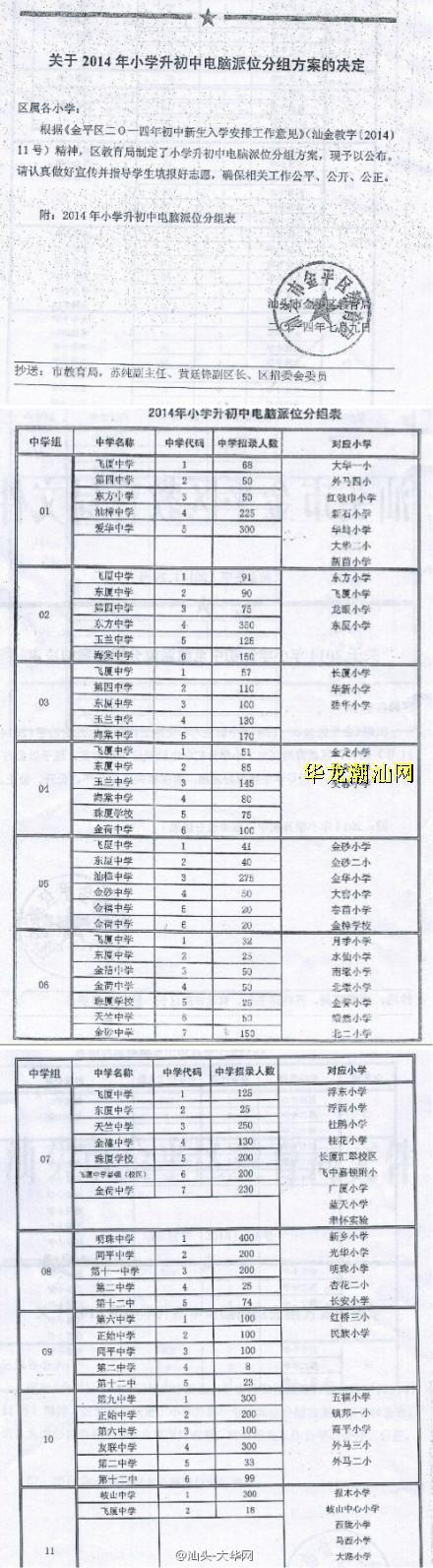 本网讯 金实龙实小升初考试成绩公布了!金实279分,龙实276分。上午十点开始发放录取通知书(可到相应学校领取),12-13日将缴费注册。另讯,金平区2014年小学升初中电脑派位分组方案已公布,见下图。