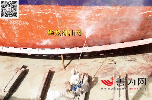 马宫渔港一家船厂里,一位工人顶着烈日在用清水冲洗渔船底部。据悉,大部分渔船船主利用休渔期,对渔船进行维护保养。