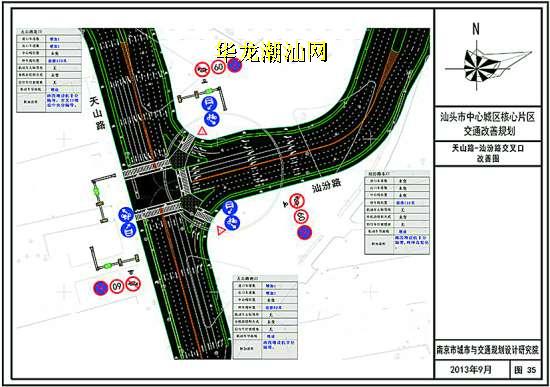 在重点改善工作方面,天山路环岛成为一个典型节点需进行改善。由于天山路-汕汾路交叉口现状为环岛组织方式,该节点也是澄海区、广厦片区出行所需的重要路段。所以每到上下班高峰,加上环岛占地面积较大,绕行严重,造成附近道路交通秩序混乱、拥堵严重。对此,规划调查后建议改环岛为“T”型交叉口,并提出了两个改造方案。方案一是天山路方向为直行方向,与汕汾路正交形成T型交叉口;方案二则将天山路至汕汾路方向为直行方向,并与天山北路形成正交T型交叉口。两种方案都将缩小交叉口规模,且采用信号控制。这样一来,天山路南北方向可各增加一条车道,而非机动车也可分隔行驶。规划建议该项改造工作在今年内启动。