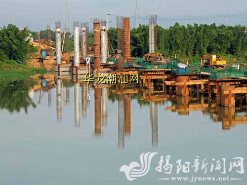 潮惠高速棉湖段榕江大桥全长1170.6米,共46跨。目前已基本完成全部桩基础,立柱盖梁完成52%.工程技术人员正抓紧灌注墩柱,争取年底完成预制箱梁的架设工作。图为大桥施工场面。 李维照 摄
