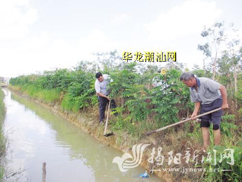 图为村民正在水渠边除杂草。黄健新 摄