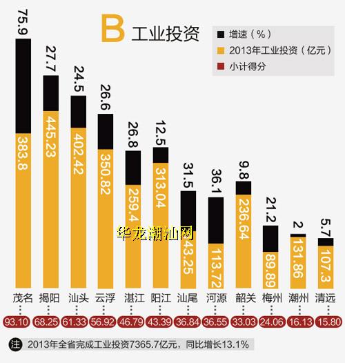 陈鸿宇从中选取权重指标进行对比分析:“揭阳规模以上工业增加值860多亿元的总量在粤东西北12市中是最大的,已经超过了汕头、湛江、韶关这些相对先发的工业城市,说明揭阳的工业化势头非常快,而且在抓大项目、规模以上工业这方面比较着力,在抓招商引资以及重点项目、重点企业的开工、达产、达标、达效都坚持不懈地抓落实,所以规上工业增加得特别快,2013年达到23.8%的增速。另一方面,揭阳的工业投资去年以445.23亿元的总量居12个地级市首位,虽然增速不算最快,但规模是最大的。这两个数据成为支撑揭阳‘主导产业做大做强’指数中排名第一的基础。”