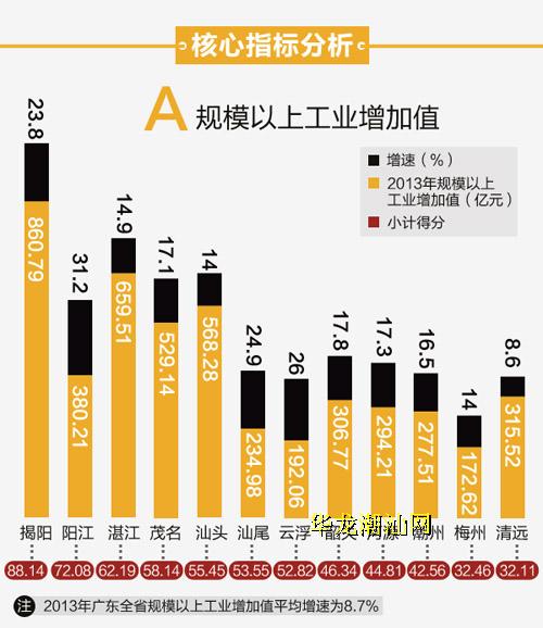 根据榜单显示,2013年粤东西北12地市中,工业发展最全面的为揭阳,其次为茂名和汕头。在分项指标中,规模以上工业增加值、销售产值排名中,揭阳均排第一。