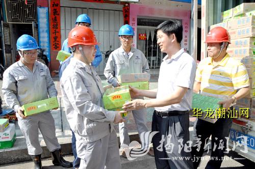 22日,市总工会组织到蓝城区和榕城区开展防暑降温送清凉活动,为顶着烈日奋战在工作一线的环卫工人代表和揭阳城区供电局职工送去一批清凉饮料。