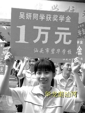 从学前班到初中毕业,连续10年受到爱心关怀,使吴妍这个懂事的女孩越发努力和勤奋,学习成绩年年在班里名列前茅。今年中考,吴妍以740分的优秀成绩被金山中学录取。喜讯传来,碧华学校的师生们为之欢欣鼓舞。董事长刘碧凤女士决定单独重奖她10000元。记者采访时,市碧华学校杨泽斌校长表示,学校将把她列入“百人成才培养计划”人选,持续资助她,直至她读完高中乃至大学,使她成长为国家的有用人材。
