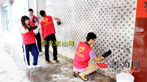志愿者们在清理道路两旁墙壁上的“牛皮癣”。