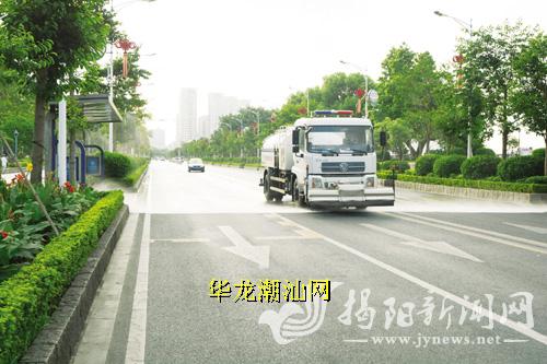榕城区环卫局一直致力于提升市区环境卫生质量,不断加大投入,配套卫生清洁设备,目前该局拥有洒水车、道路清扫车各3辆,路面清扫卫生环卫工人1000人左右。据该局有关负责人介绍,洒水车每天早晨集中在市区主要路段进行洒水,中午在部分路段洒水,力争做到道路卫生无死角,为市民营造一个优美、舒适、整洁的城市环境。图为洒水车正在临江北路路段喷洒路面。