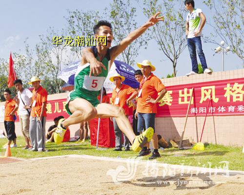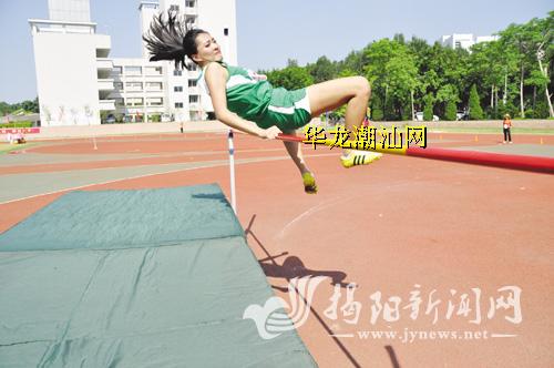 揭东队跳高冠军在比赛中。