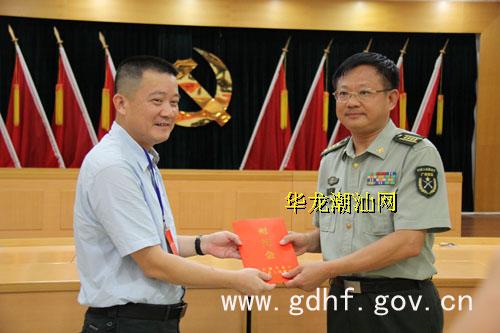 县长陈德忠(左)为汕尾军分区送上节日慰问金