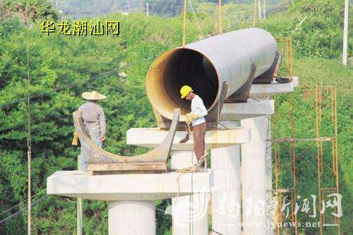 惠来县中东部供水工程的施工难度还在于供水线路长,管线穿越河道、灌渠、高速公路等,地形复杂,对施工干扰很大,同时,供水管线接头多,止水严密,安装技术要求也高。记者在邦山泵站出口管道架空段看到,工人们顶着烈日,站在近10米高的管桥支墩上,由吊机将地上的输水管道吊起,然后在高空上进行焊接,由于长期日晒,工人们每张脸犹如戏曲中的“关公脸”。
